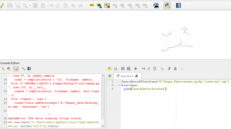 • Pour ouvrir une couche shapefile (dans mon cas le fichier est stocké dans le dossier Tanger_Data qui est dans le disque D, on peut utiliser le code suivant :